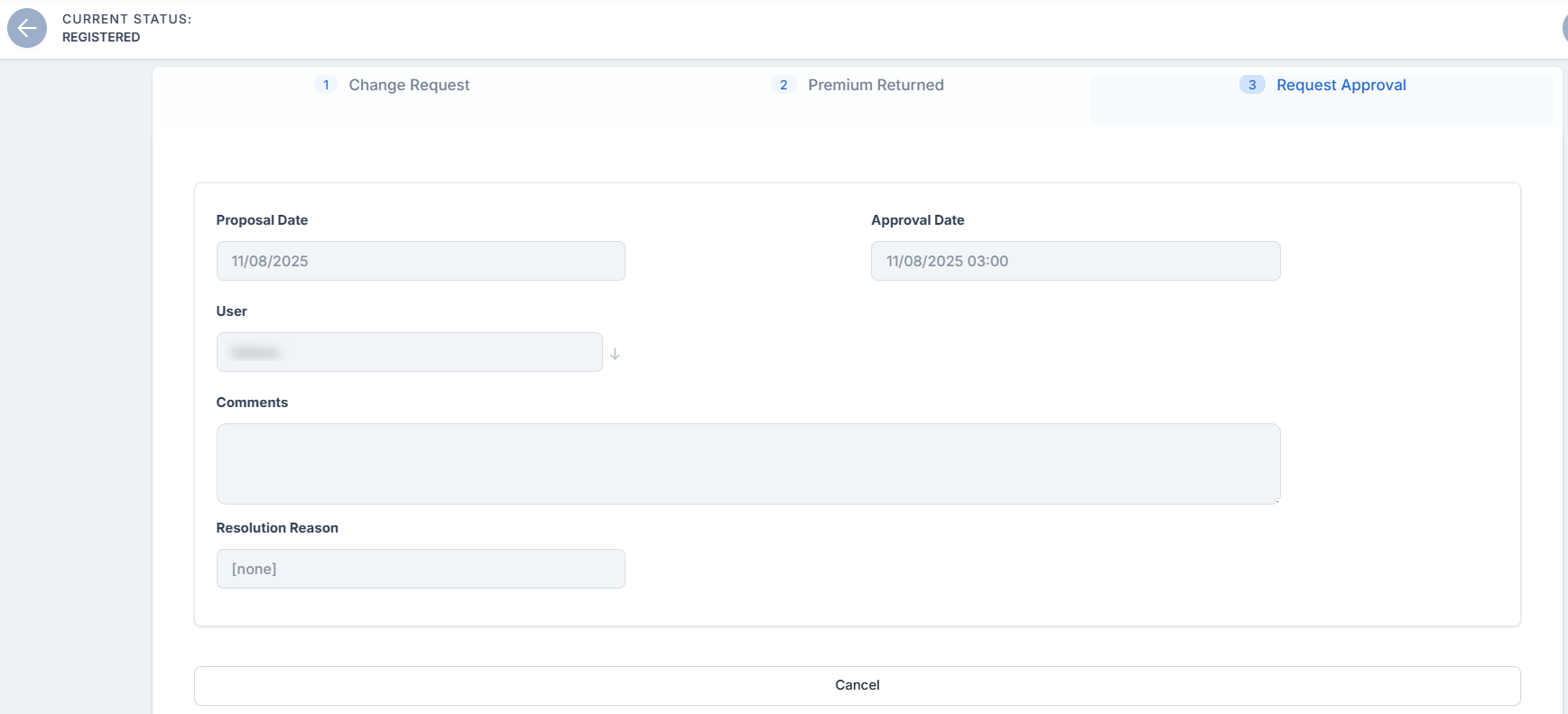 Click Register and the cancellation request moves to the Pending Approval status. The Premium Returned tab is now displayed.