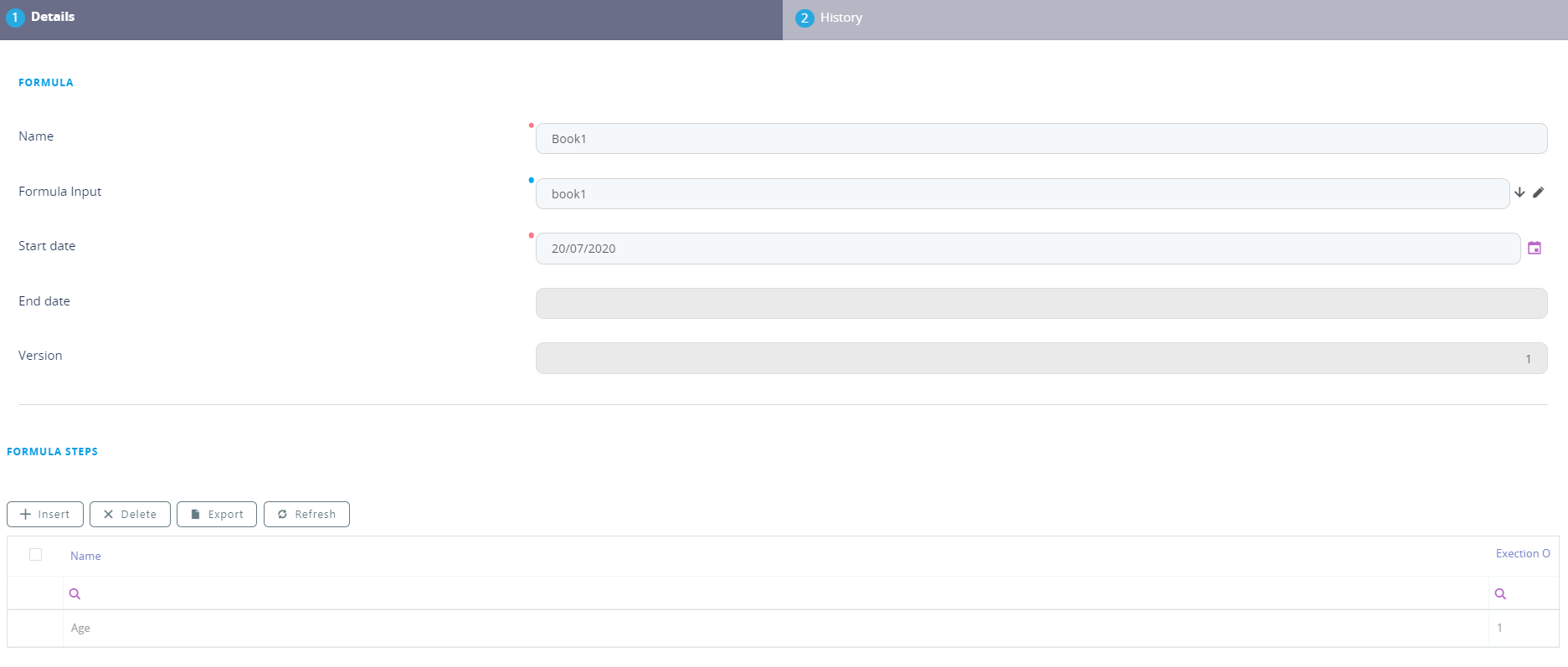 - In the formula screen, in the Formula Steps section, click the Insert button to add a step.