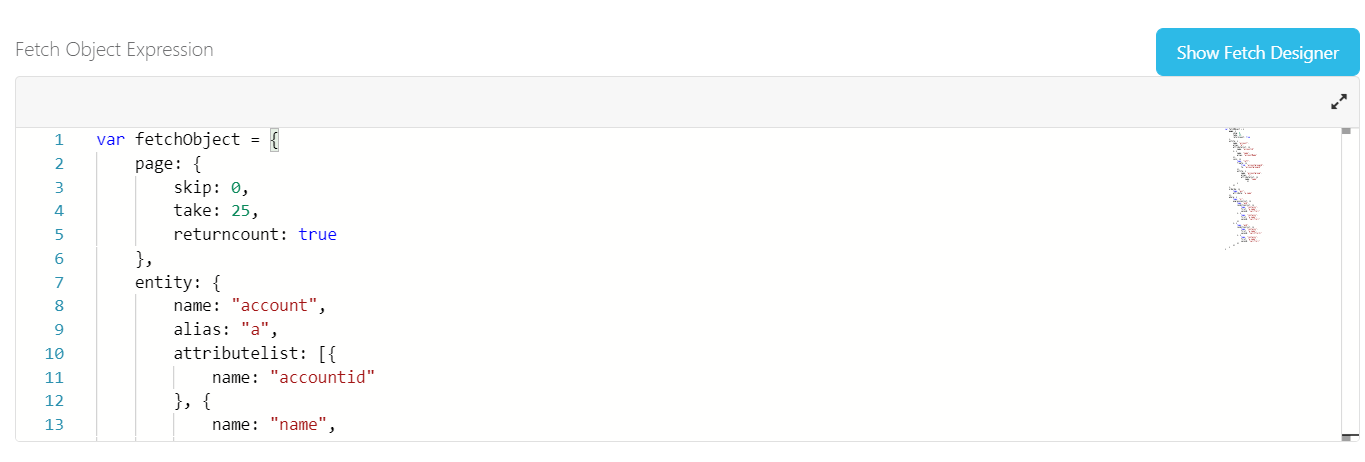 In the Fetch Object Expression field, provide the custom fetch expression, that is a JavaScript object. It might query and return attributes from various entities.