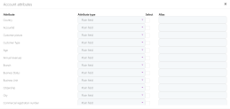 After selecting all the entities from where you want to extract information, for each entity, select the attributes to be included in the fetch. To do so, click the Attribute list button displayed below each entity. The Attributes list page will be displayed. It lists all the attributes existing on that entity. The figure below shows the attributes of the Account entity: