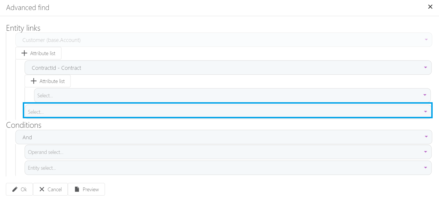 - Select an attribute existing on the entity previously selected. Below the selected attribute, the Select operand field will be displayed.