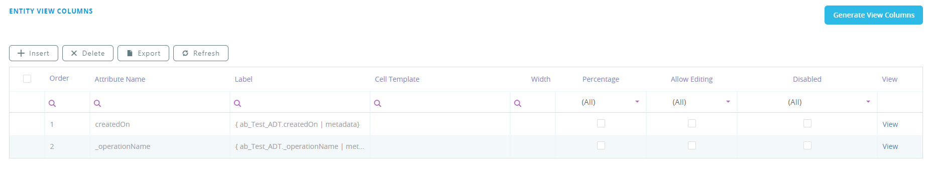 To define the view columns from the Entity View columns, click the Insert button at the top of the section. The Add Entity View Column page will be displayed. Provide the following view column details: