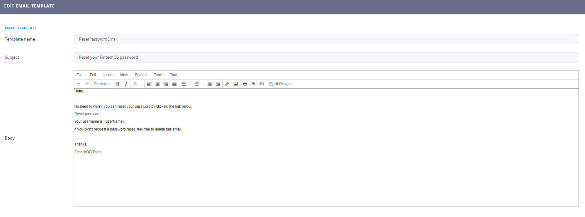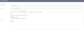 Field Data type Description Template Name Text Type a name for the template. Subject Text Type a subject to be used in the email. Body Design the body of the email. For more information, see UI Designer. - Click the ''Save and reload'' button.