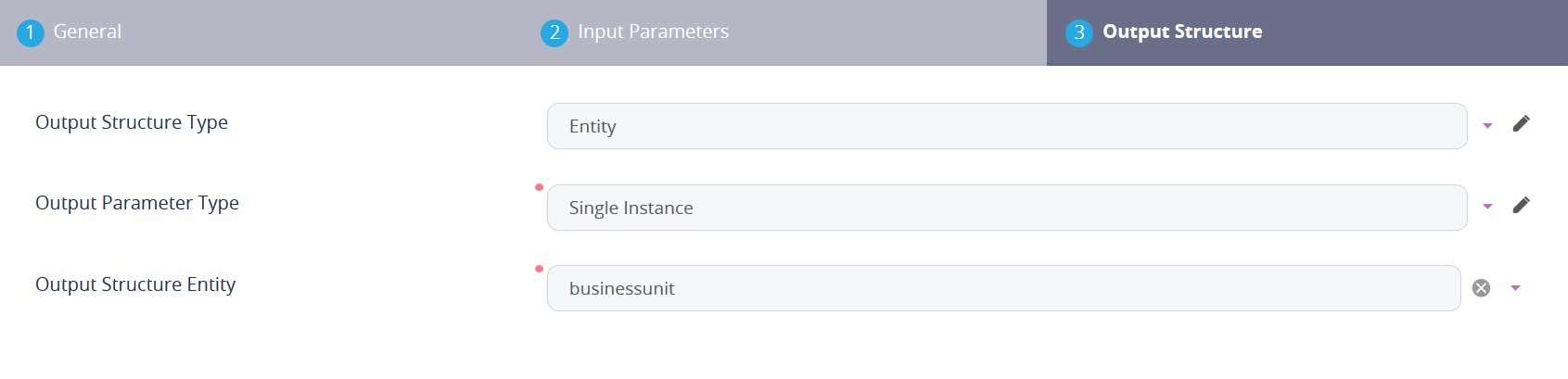 In this example, we create a single instance output based on the businessunit entity, which has the following attributes: businessunitid, name, and parentBusinessUnitId.