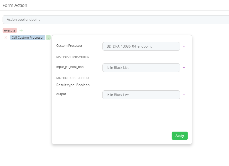 | Call Formula with data mapping | Runs a predefined formula for calculation of input data. See Calling the Business Formulas. | Business Formulas | Call the formula for calculating the policy of an insurance. |
