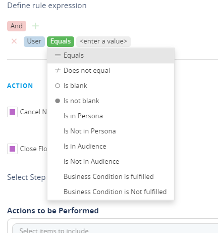 - Define rule expression based on which specific action happen. It is possible to add a condition or to add a group. When adding a condition it is possible to add a ''Checking with Custom Processor''.