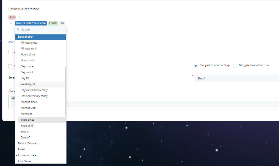 To override the default next step set though the digital journey order index, go to the step from which the transition will be done, select the next step using the Option set.