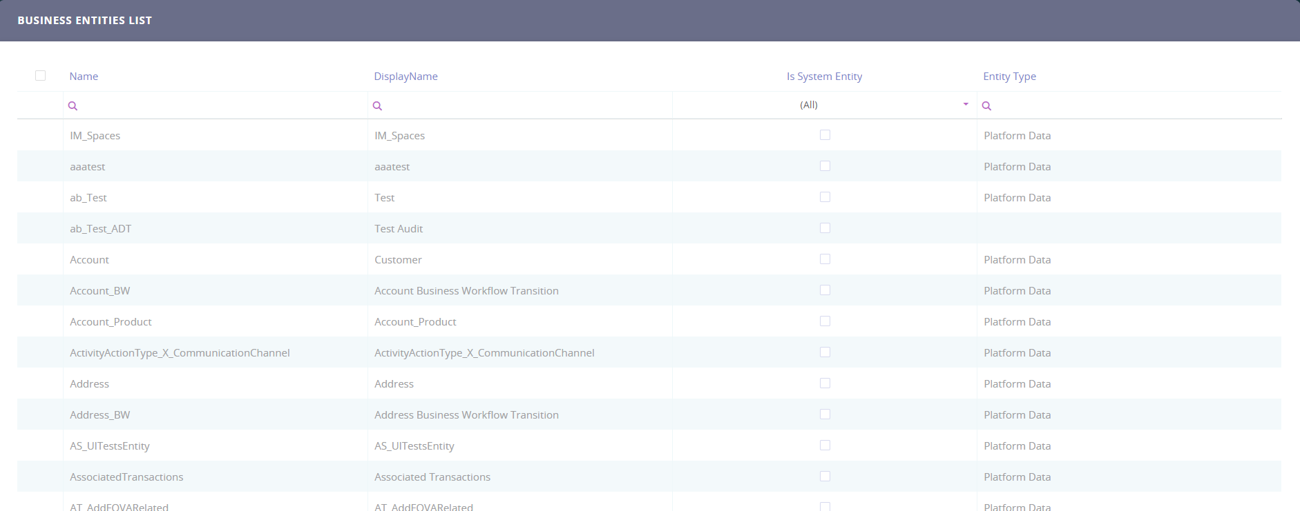 You can filter entities by all the search fields displayed in grid, including Name and DisplayName. You can apply multiple filtering criteria at the same time.