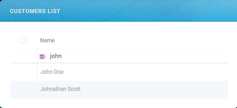 For example, a portal user does a partial search (“john”) by Name on the Customers list. The search returns all names that contain “john”.