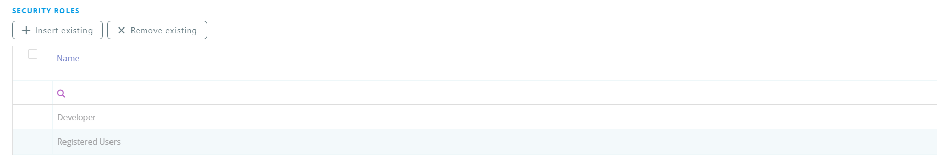 - Go to the endpoint configuration page (Edit Endpoint page), scroll down to the SECURITY ROLES section and click the Insert existing button. A window appears which lists all defined security roles.