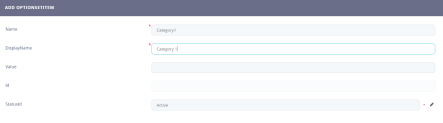 - At the top -right corner of the page, click the Save and close icon to save the category. Add as many categories as best suit your needs. They are displayed in the OptionsetItems section.