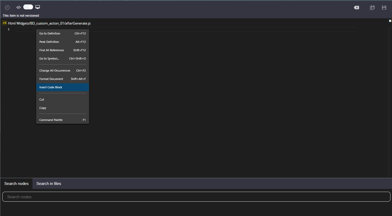 - Place the cursor inside the desired After generate JS, right click and from the contextual menu click Insert Code Block.