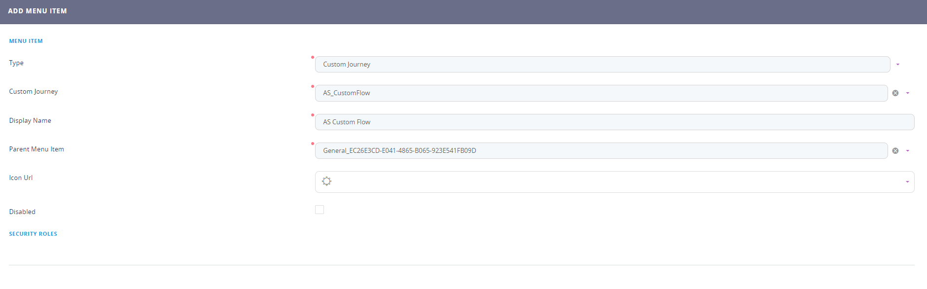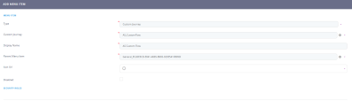 Custom Journey This field will open once you have chosen the type. Select the flow you wish to add. Display Name Insert the name of the flow. Parent menu item This field is optional, only if you are adding the flow inside another menu item. It shows the name of the menu item inside where the flow will appear.