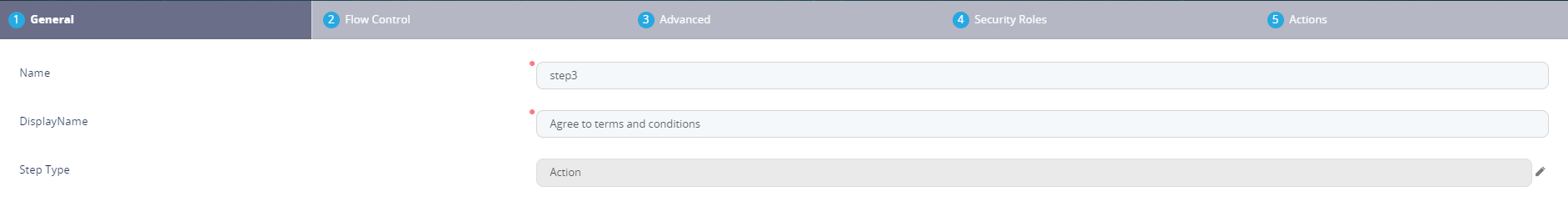 - Fill in the fields to configure the Flow Control, Advanced, Creating Security Roles and Defining Form Actions. They behave as for a default step.