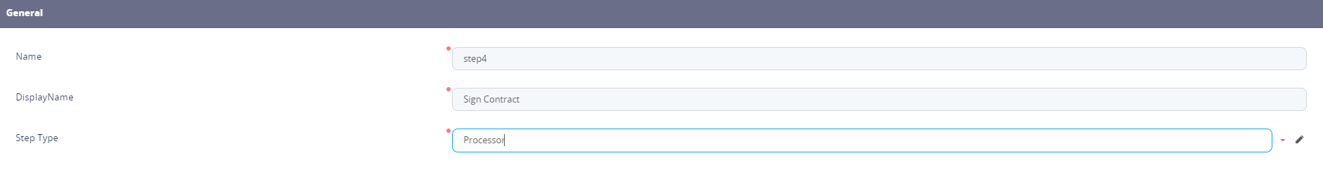 - Click on ''Insert'' and fill in the name of the step, display name and for Type from the Option set select the Processor.