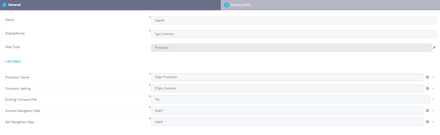 Fields Required Data type Description Name Yes Text It is automatically filled. It is the name of the step. Display name Yes Text It is automatically filled. It is the name of the step. Step Type Yes Option set It is automatically filled. It is the name of the step. Processor name Yes Option set Select the name of the processor. Processor settings Yes Option set Select the settings you configured earlier for the processor. Existing Compare file Yes Option set When using the Face recognition or Face recognition with Liveness, this field enables the system to compare the selfie with the photo for an ID. Success navigation step Yes Option set Select the step you wish to be next if the processor step is a success. Fail navigation step Yes Option set Select the step you wish to be next if the processor step is a failure. - Click the ''Save and reload'' button.