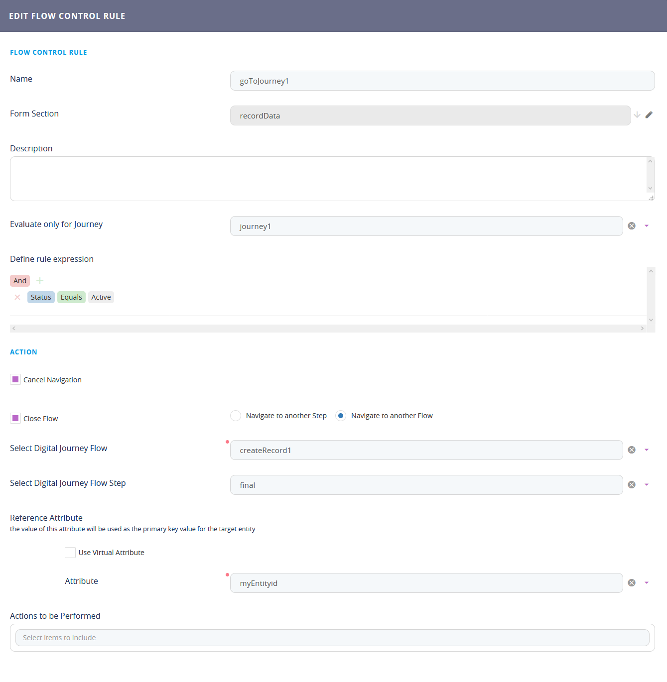 - Select the ''Actions to be Performed''. From the list created in Defining Form Actions select the Action to be triggered when the rule is applied.