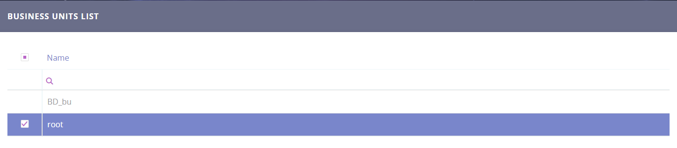 Depending on your organizational needs, there will always be only one root business unit and at least one business unit. The root business unit acts as the top level of the organizational hierarchy and all other business units are its children. The root business unit is the company while the child business units are subsidiaries or departments within the company.