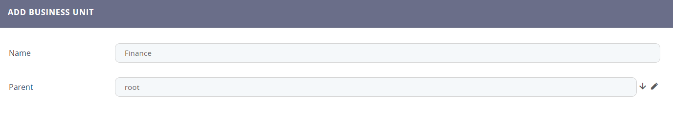 - If this is the first business unit you add, then select root otherwise, select the parent business unit so that it reflects your organization structure. The figure below shows an example on how to add the first business unit.