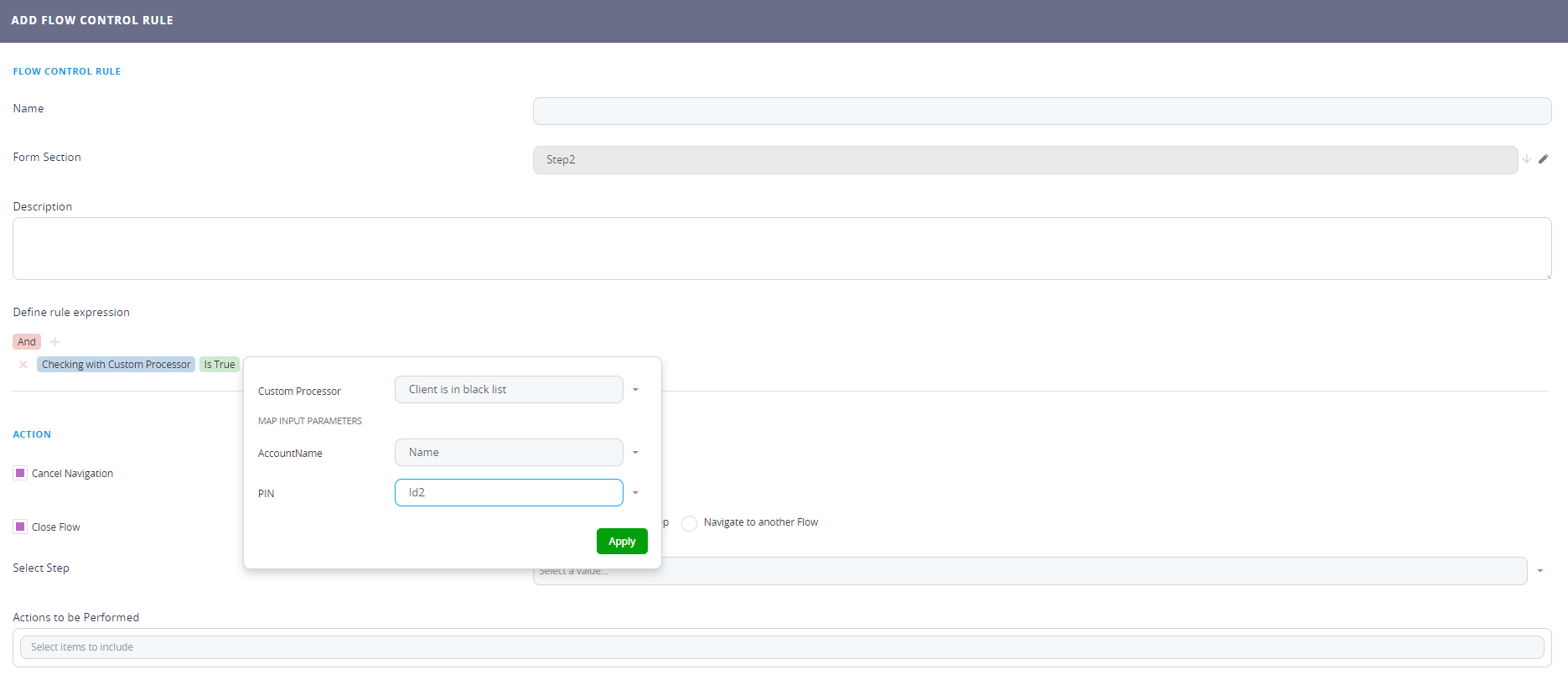 6. Define rule expression based on which specific action happen. It is possible to add a condition or to add a group. When adding a condition it is possible to add a ''Checking with Custom Processor''.