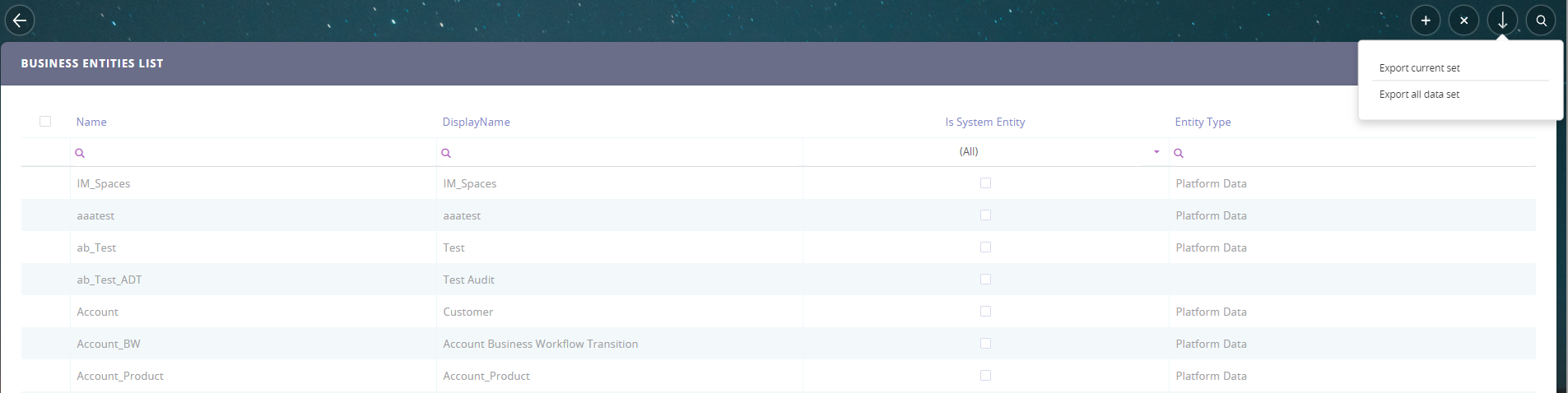Innovation Studio allows you to export the records from any entity (including entity and attribute). To do so, at the upper-rigtht corner of the page, click the Export icon and select one of the export option: