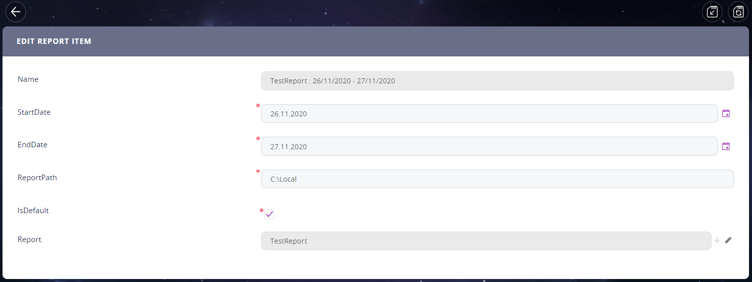 7. At the top-right corner of the page click the Save and reload icon if you want to add another report item, otherwise, click the Save and close icon.