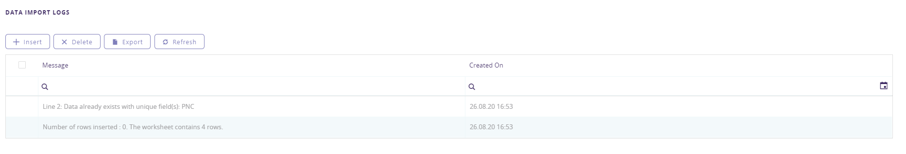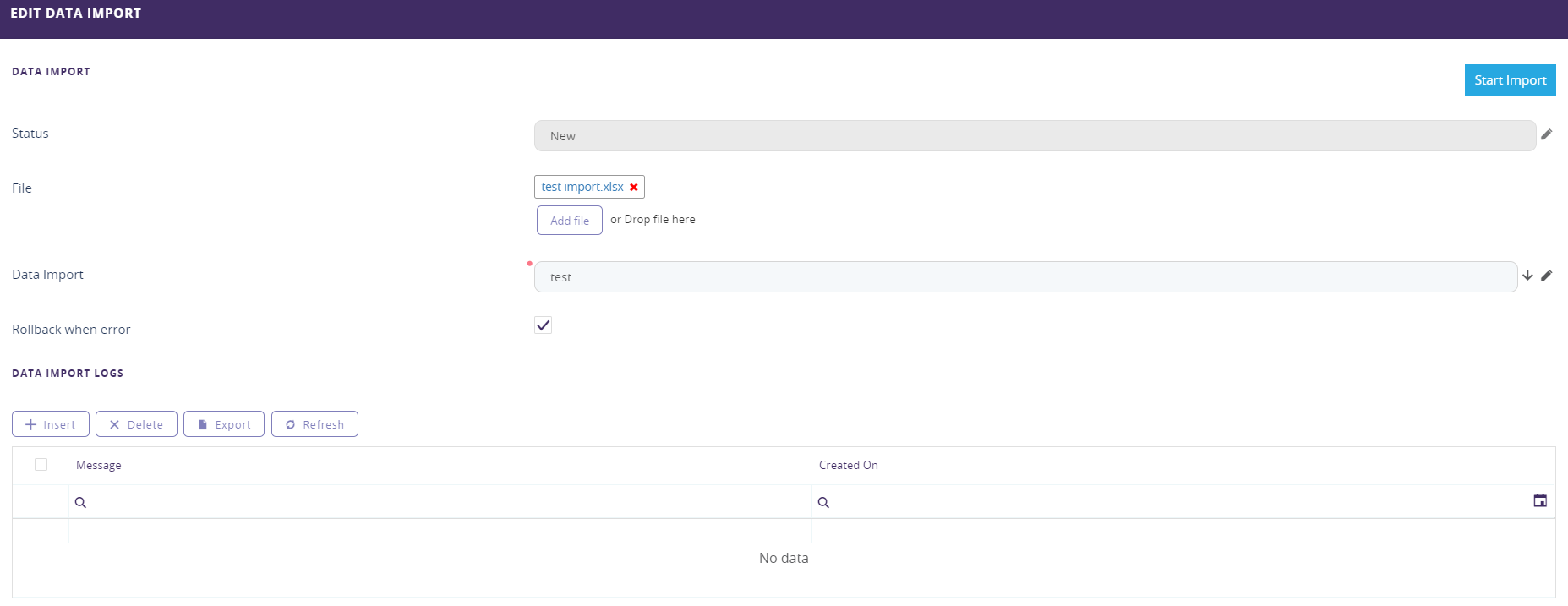 File File Add the Excel file here. Data Import Option set Name of the template. Rollback when error Bool This checkbox will enable the process of coming back to the initial state of the data base when the import fails. - Click the ''Start Import'' button. In the DATA IMPORT LOGS grid, the history of the process will be recorded. If the is an error the messages will be shown here.