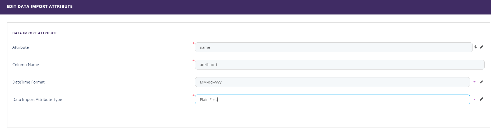 - In the list of data import attributes, click the ''insert'' button to insert an attribute by filling in the following fields: