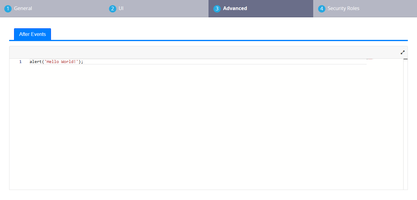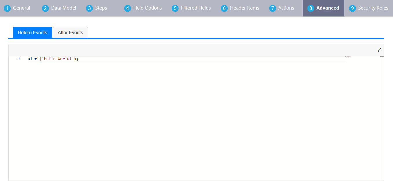 The code in the Before Events and After Events tabs will run when the flow is loaded.
