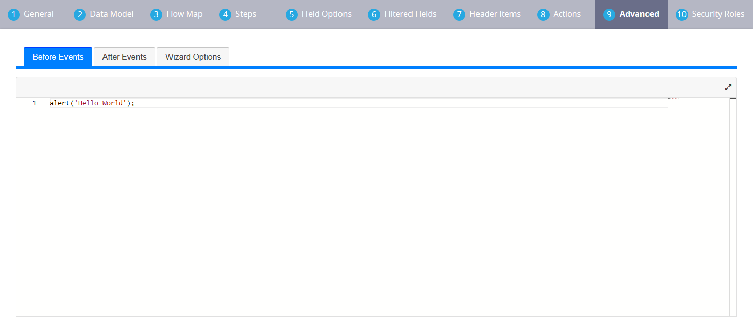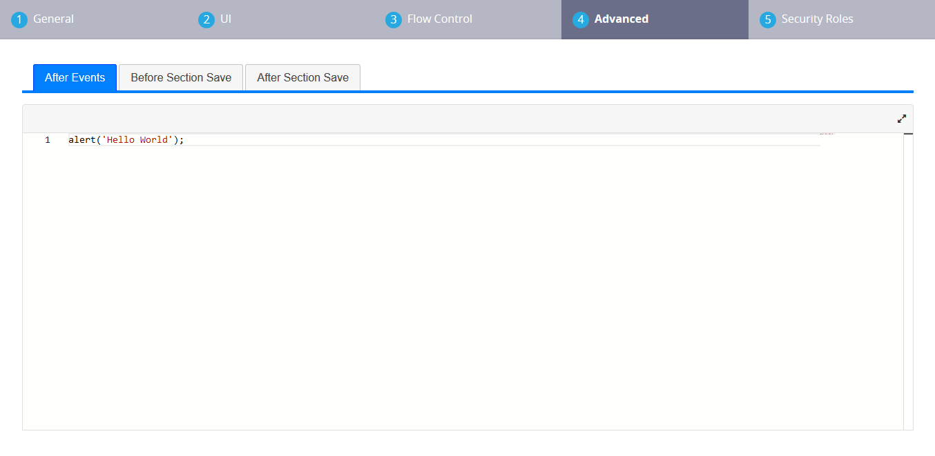 The code in the Before Section Save and After Section Save tabs will run when you advance either to the next step in the wizard (click the Next button) or, if this is the final step in the flow, you conclude the wizard (click the Finish button). This allows you to run distinct operations before and after the step's data is committed to the database.
