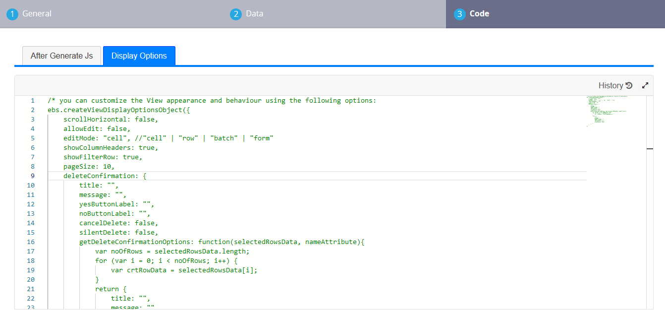 The code in the Display Options tab allows you to define settings for the view's look and feel, such as scrolling, headers, filter row, page size, or the ability allow records editing in the view. The Display Options tab is pre-populated with the available settings commented out which you can modify according to your preference. These settings supplement the no-code view customizations.