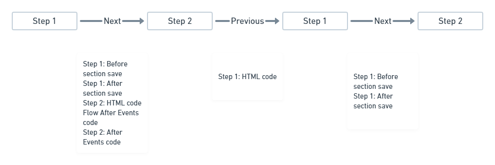 When you go back to a previous step in the wizard (using the Previous button), no After Events or Section Save code (Steps 6, 7, 9, or 10) is executed. Then, if you advance again to a step that you opened previously (using the Next button), only the current step's Section Save code (Steps 9 and 10) is executed. The next step's After Events code (Steps 6 and 7) is not executed again.