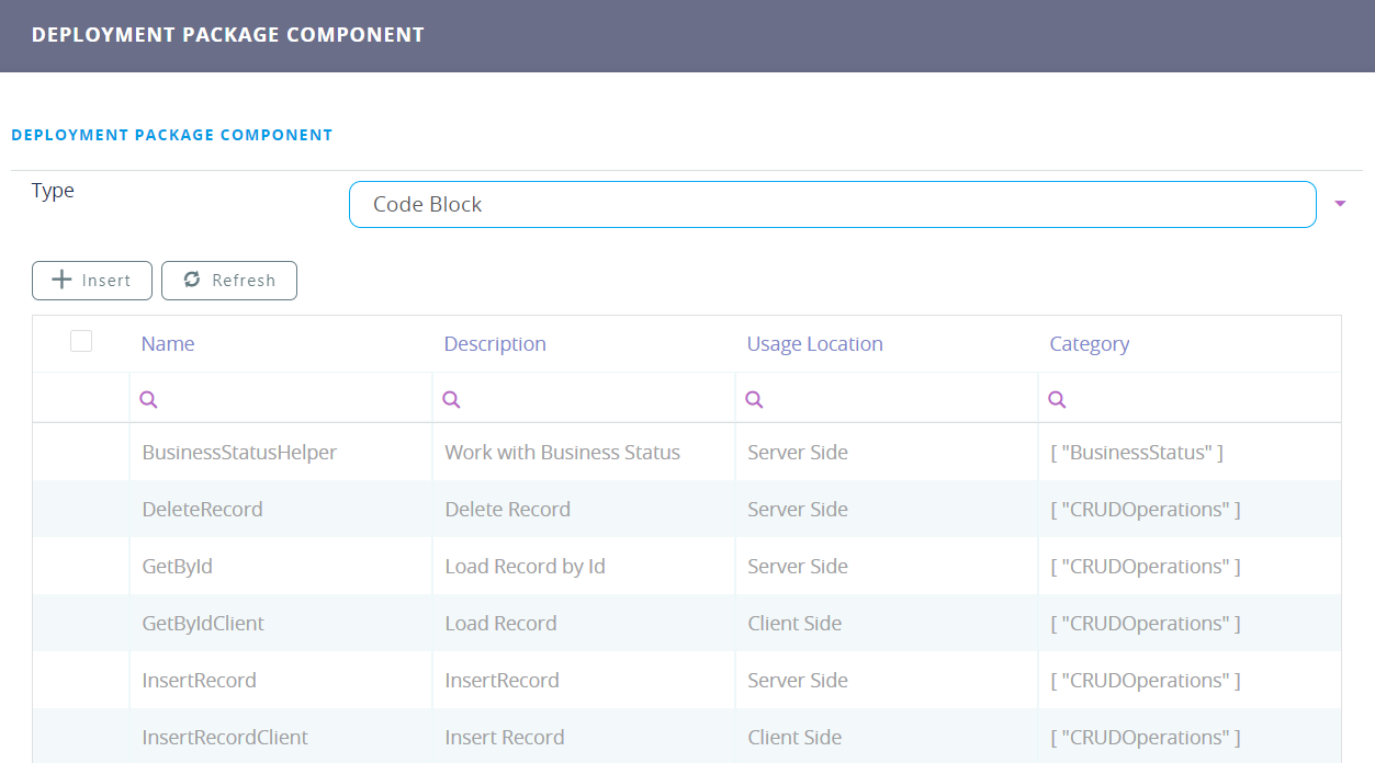The package will contain the configurations created in FintechOS, not the records inserted in the FintechOS Portal. To export the records use, Configuration Data Definitions and Configuration Data Deployment Package. - Below the Type field, the list of metadata matching the selected type is displayed. The figure below shows an example of Code Blocks records.