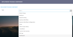 To deploy the extended model of an entity you need to export that entity as well.Business workflow Business workflow configurations Unlike the previous component, here you can add just the statuses of a workflow. Chart Client script library Code block Custom Page Template Templates used to customize various user interface components, such as session expiration pages or login screens. For more information, see Custom Page Templates. Custom user journey DB Task Dashboard Data Config definition Data Import Template Data maping Data model Data set This is a data set used in Data Sets for a business formula. Digital journey With this type, it exports the form driven flow as well. Therefore, to export a form driven flow, attach it to a digital journey. When it will be imported, it will impoert the flow and the journey. Email template Endpoint This deploys the server-side scrip attached to the endpoint as well. There is no need to attach the script separately. Entity form Entity menu section Entity Status Entity view Formula HTML widget Menu item Option set Portal profile PowerBI report Report Report document Script library Schedule Job