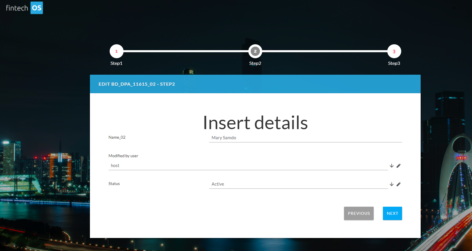 Grouping entity information in sections, herein referred to as steps, based on specific criteria (business, operational or other relevant to you) is useful especially in complex financial activities when you have to display a lot of information on digital journeys. You can add as many steps as you need in the Steps section (tab) based on your criteria.