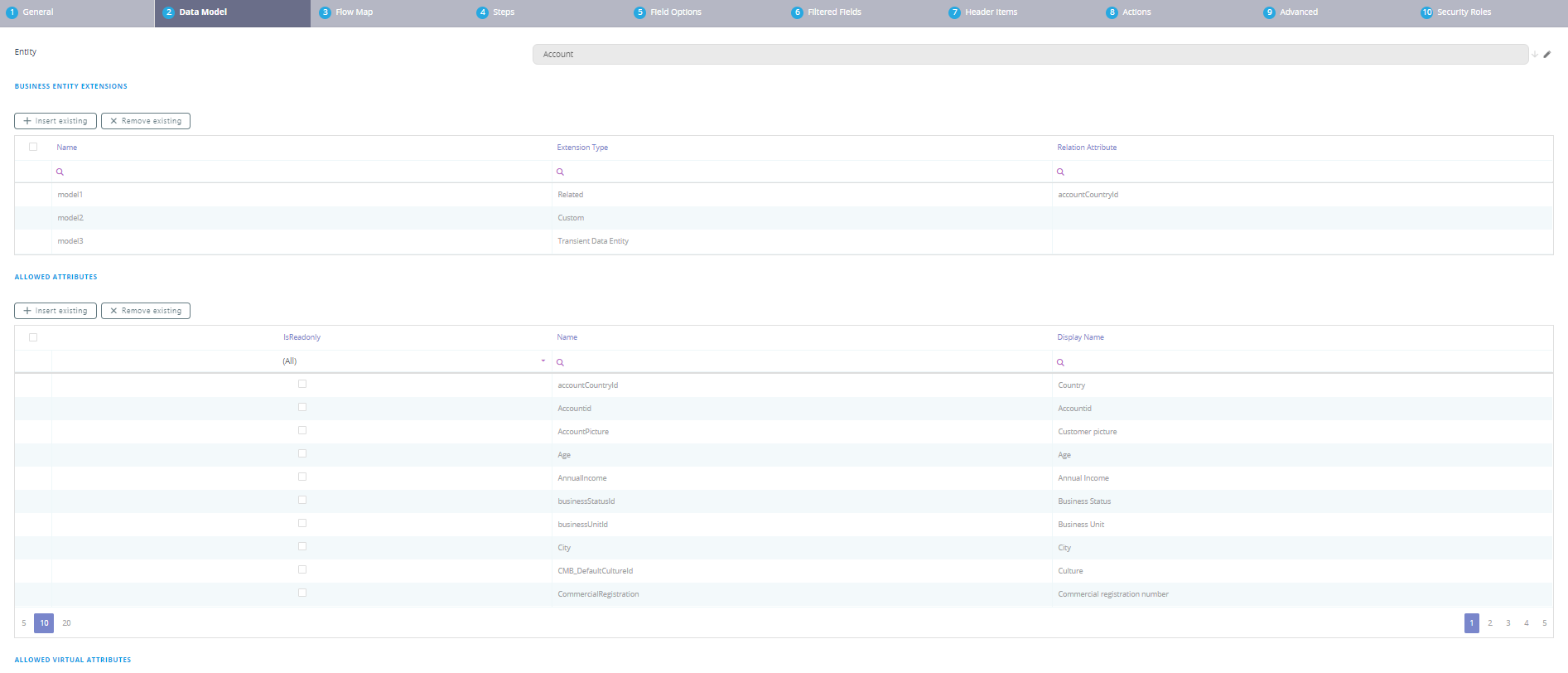- If you wish to restrict the form's access only to specific attributes in the data model, insert the corresponding values in the Allowed Attributes and Allowed Virtual Attributes sections. By default, all attributes in the data model are available to the form's context. Once you start populating the allowed attributes sections, the form will be restricted from accessing any attributes except the ones explicitly defined in these sections.