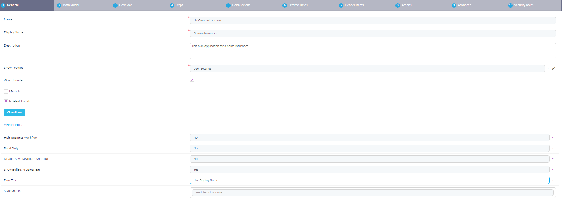 To duplicate a form driven flow with all of its configurations, in the General tab, click the Clone Form button.