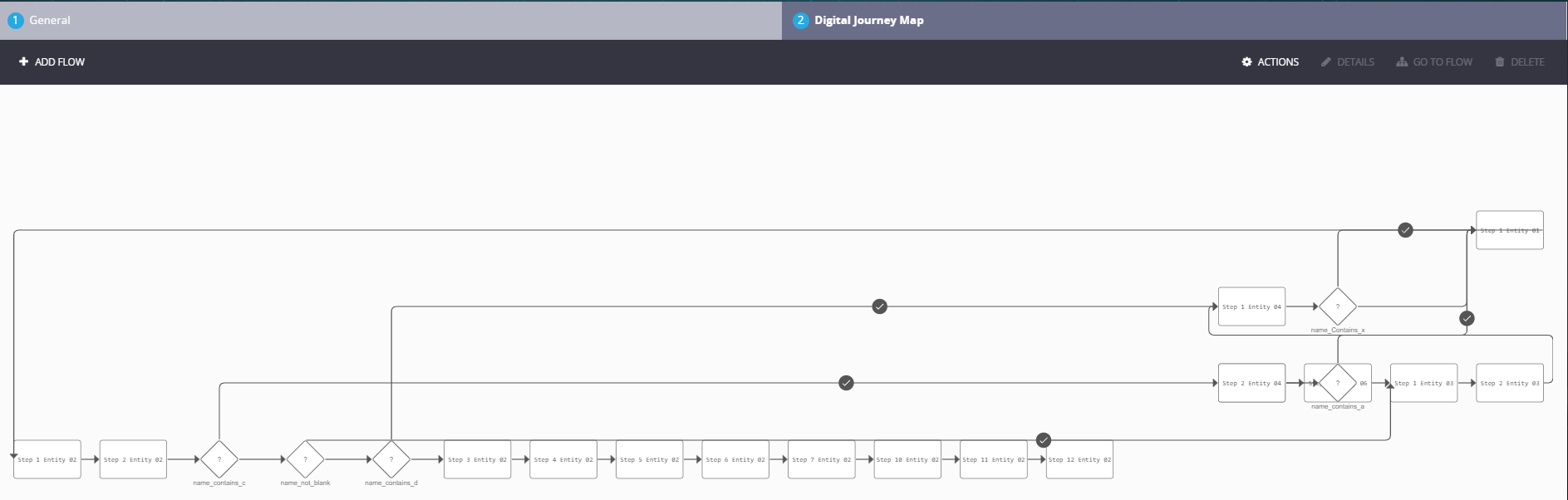 When building a digital journey, it is possible to have many form driven flows dedicated to the same digital journey, but each has a different set of steps that may be related to the other flows. In order to build visually aesthetic journeys with customer flows and operator flows, FintechOS makes it possible to see all the flows on one journey in a map.