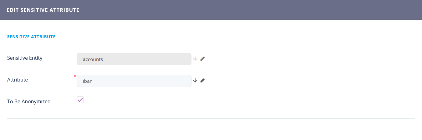 Only attributes with sensitive types can be searched in data anonymization requests. - To Be Anonymized - Check to indicate that, if a sensitive entity record is subject to data anonymization, this attribute will be anonymized in accordance with its data type: