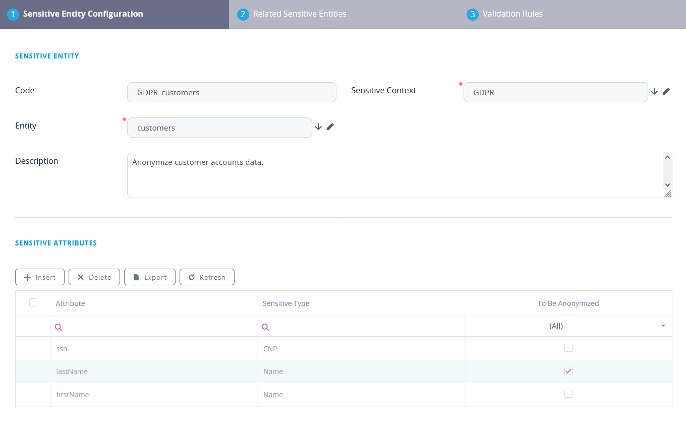 Each sensitive data definition is built around a sensitive entity (and, optionally, its related entities) on which the anonymization is applied. The sensitive data definition also specifies the validation rules that must be fulfilled in order to allow the anonymization.