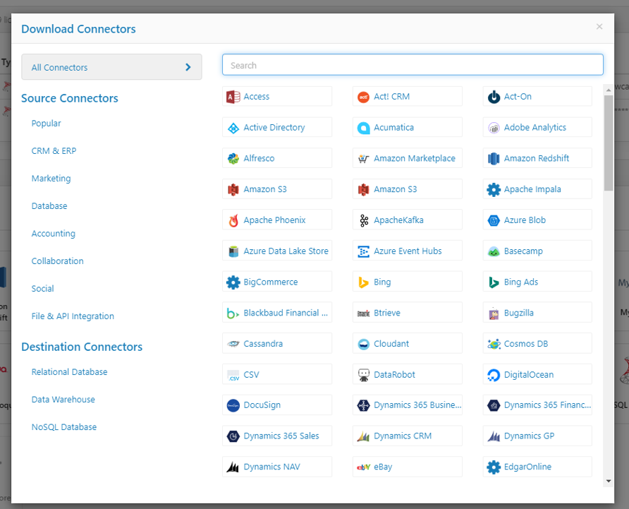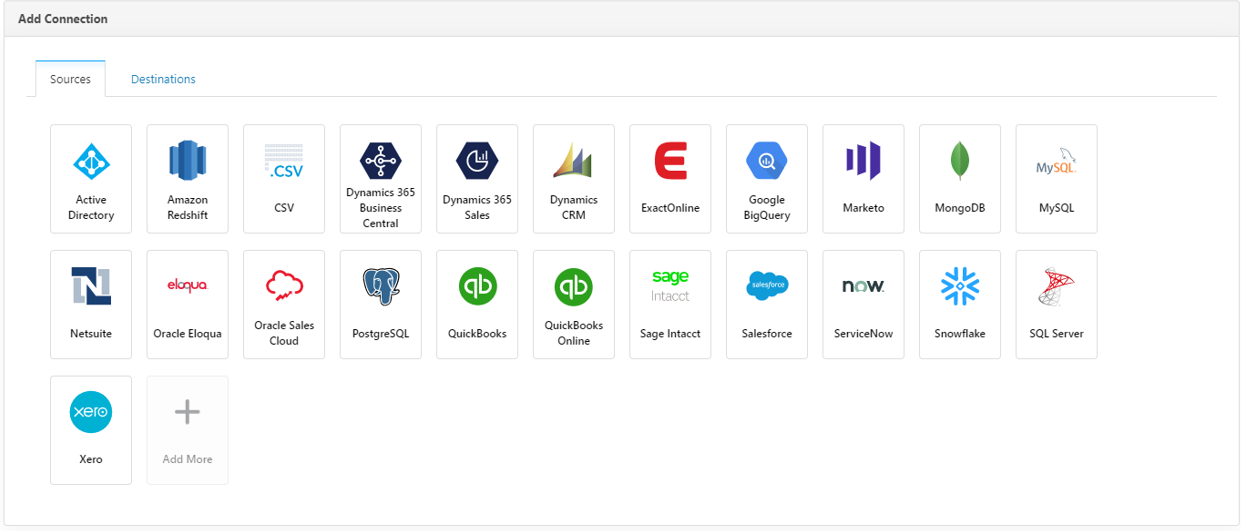 - Scroll down to the Add Connection section, select the Sources tab, and select the connector that matches the source system for the desired data replication.