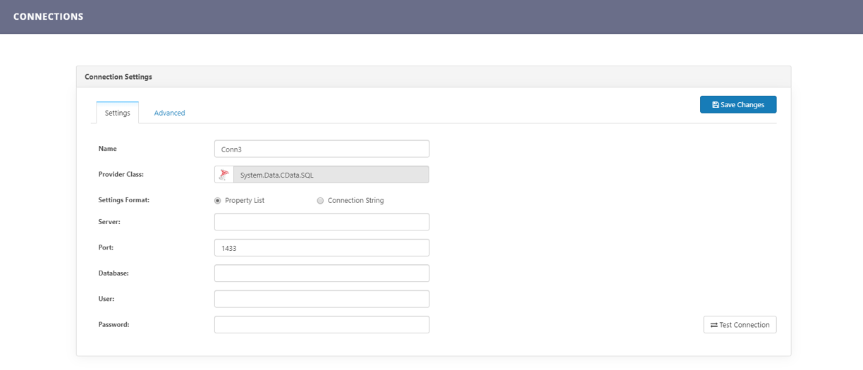 - Configure the connection settings specific to the selected connector. For details about each specific data source settings, see the CData Sync documentation.