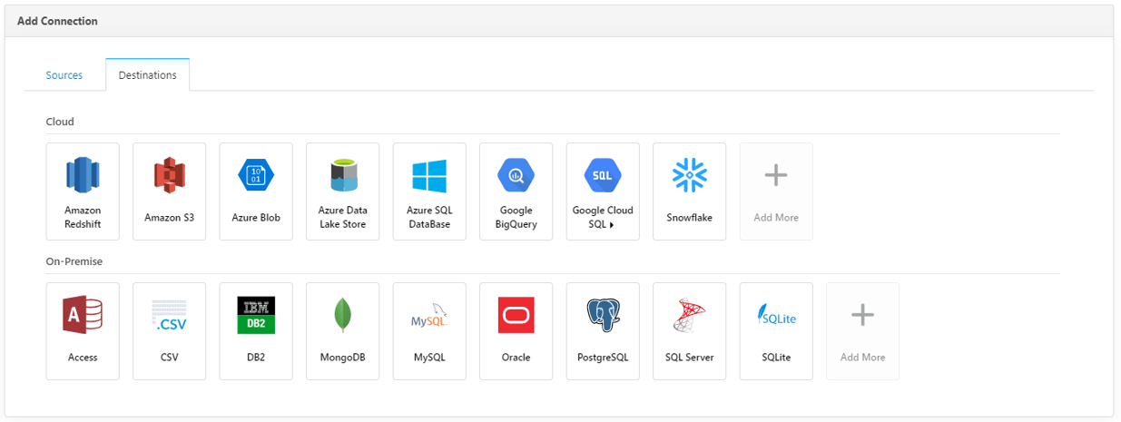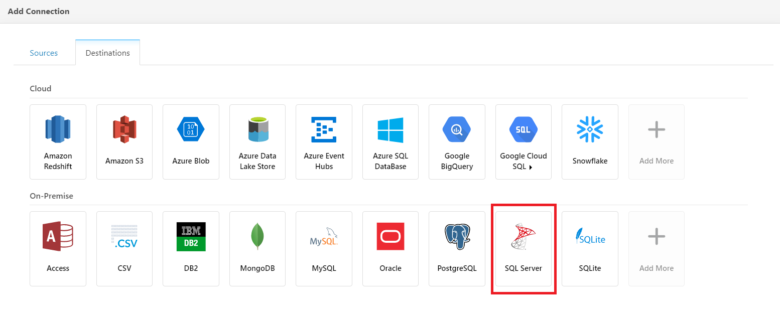 - Scroll down to the Add Connection section, select the Destinations tab, and select the connector that matches the destination system for the desired data replication. In the case of FintechOS, this will be the SQL Server.