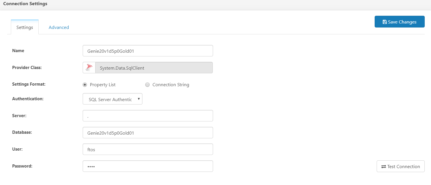 Setting Description Name Enter a representative name for your connection. Settings Format If you prefer to enter all the connection settings using a single database connection string, select Connection String. Otherwise, leave it as Property List. Authentication Leave SQL Server Authentication. Server Enter the name of the SQL Server running on your machine.