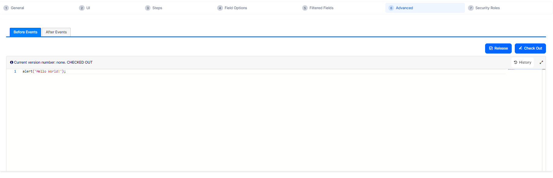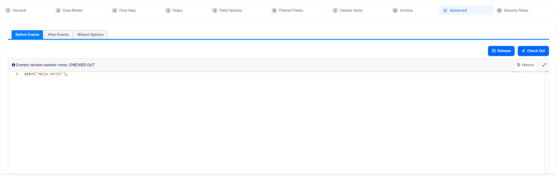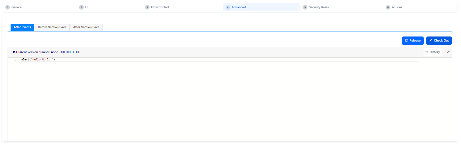 The code in the Before Section Save and After Section Save tabs will run when you advance either to the next step (click the Next button) or, if this is the final step in the flow, you conclude and click the Finish button. This allows you to run distinct operations before and after the step's data is committed to the database.