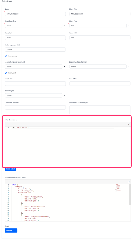 In the chart editing windows, there is a section called After Generate Js where you can add client code that is executed when the chart is rendered.
