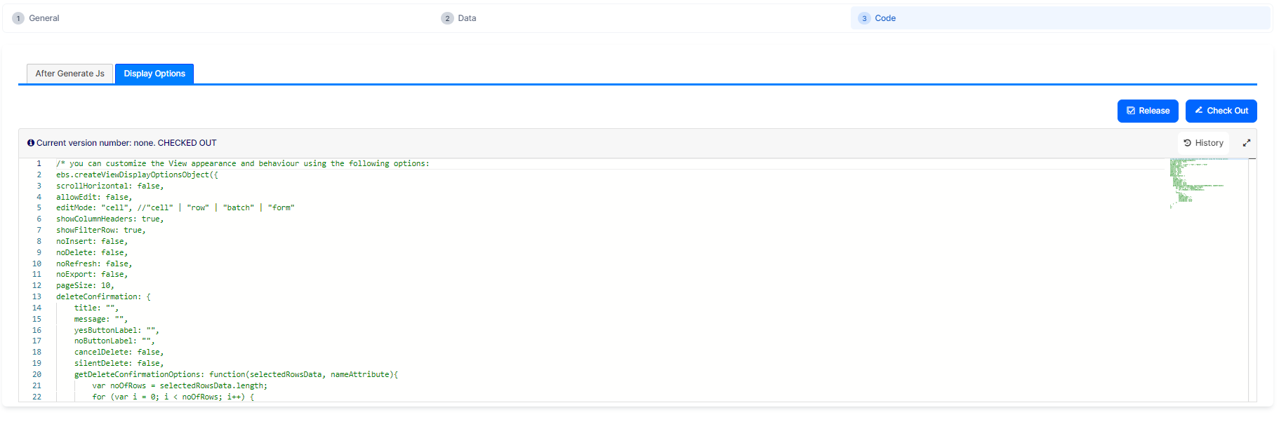 The code in the Display Options tab allows you to define settings for the view's look and feel, such as scrolling, headers, filter row, page size, or the ability allow records editing in the view. The Display Options tab is pre-populated with the available settings commented out which you can modify according to your preference. These settings supplement the view customizations.