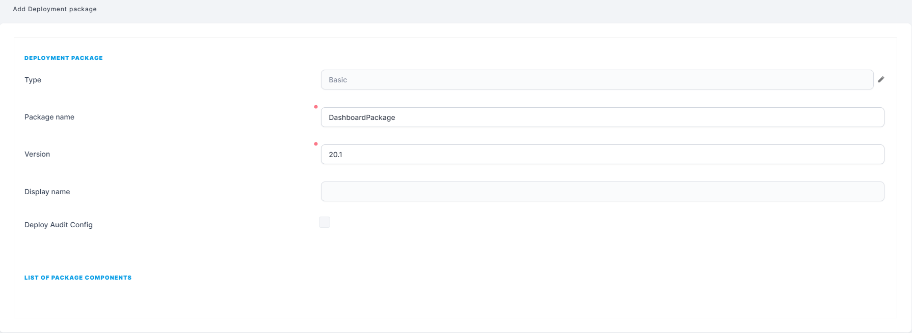 - Fill in the Package Name and Version fields.