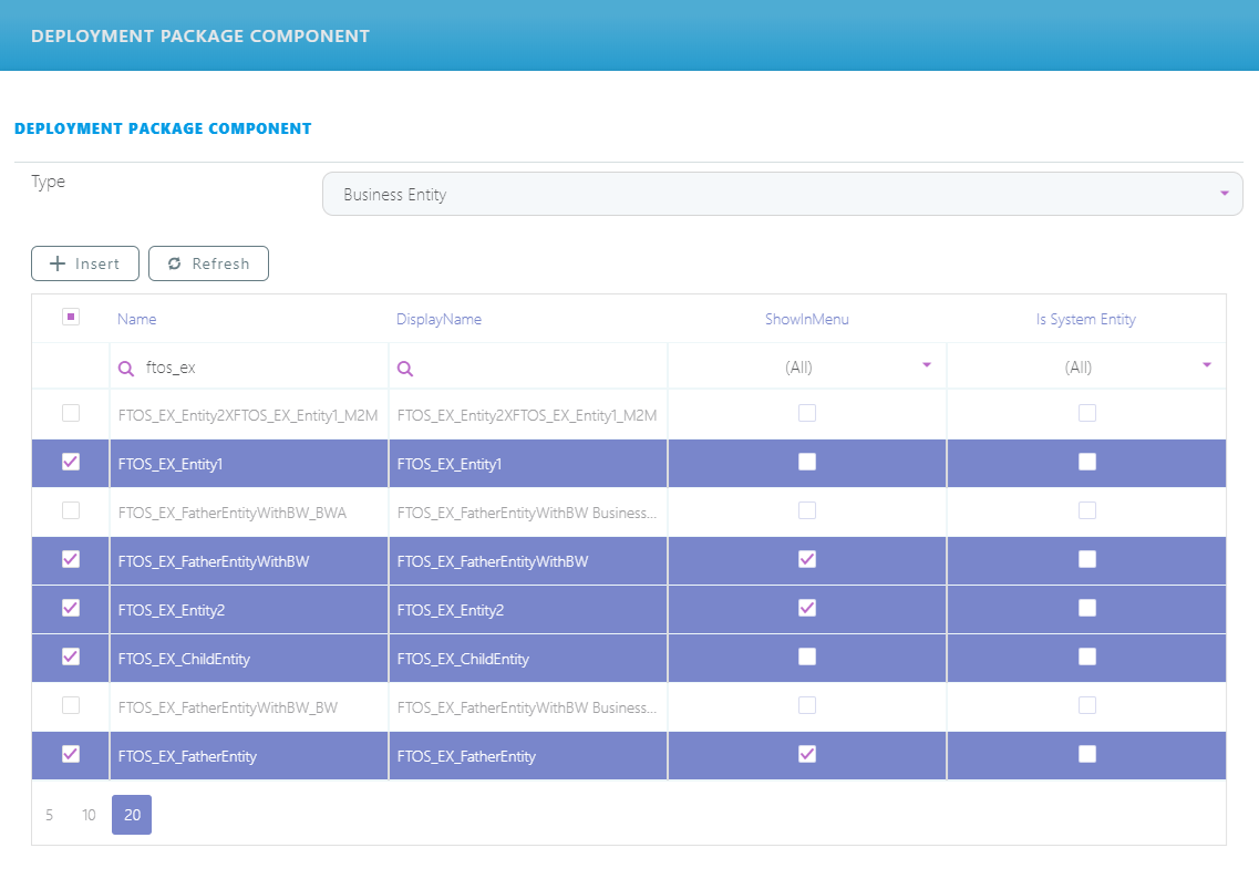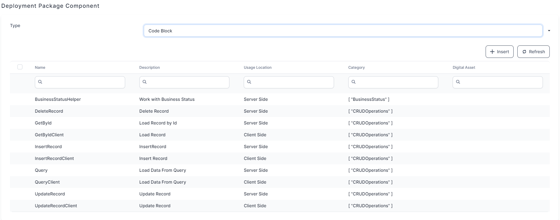- From the displayed list, select only the components you want to add to the deployment package. You can add multiple components to the package by selecting the desired records from the components list and clicking the Insert button.