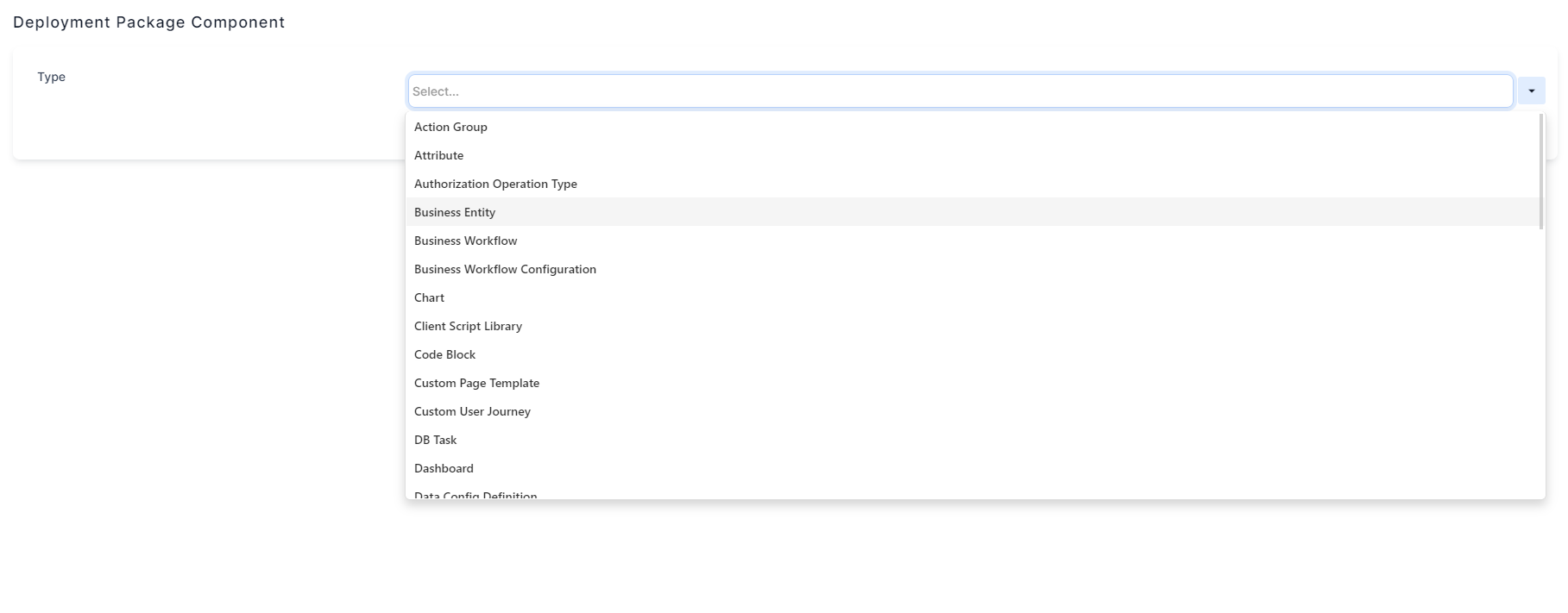 To deploy the extended model of an entity you need to export that entity as well.Business Workflow Business Workflow Configurations Unlike the previous component, here you can add just the statuses of a workflow. Chart Client Script Library Code Block Custom Page Template Templates used to customize various user interface components, such as session expiration pages or login screens. Custom User Journey DB Task Dashboard Data Config definition Data Import Template Data Maping Data Model Data Set This is a data set used in Data Sets for a business formula. Digital Journey You can use this type to export form driven flows. Therefore, to export a form driven flow, attach it to a digital journey. When it will be imported, it will import the flow and the journey. Email Template Endpoint This deploys the server-side script attached to the endpoint as well. There is no need to attach the script separately. Entity Extension Entity Form Entity Menu Section Entity Status Entity Unique Constraint Entity View Formula HTML Widget Menu Item Option Set Portal Profile PowerBI Report Report Report Document Script Library Schedule Job